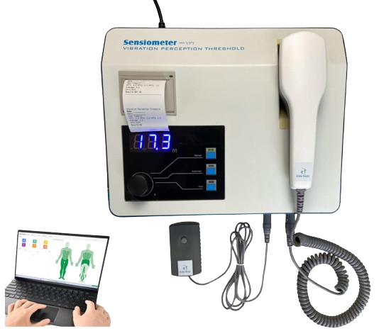 Mit einem externen Gerät, dem so genannten digitalen Biothesiometer, wird der Verlust der Vibrationsempfindlichkeit bei diabetischen Füßen gemessen. Es ist auch als Siowin, Vibrometer, Vibrosense oder Sensiometer VPT bekannt. Es wird zur Überprüfung des Ulkusrisikos und zur Quantifizierung der diabetischen Polyneuropathie eingesetzt. Das Gerät verfügt über eine elektrisch angeordnete Gabel, die die Vibrationen langsam erhöht, wenn der Patient das Gefühl verliert.